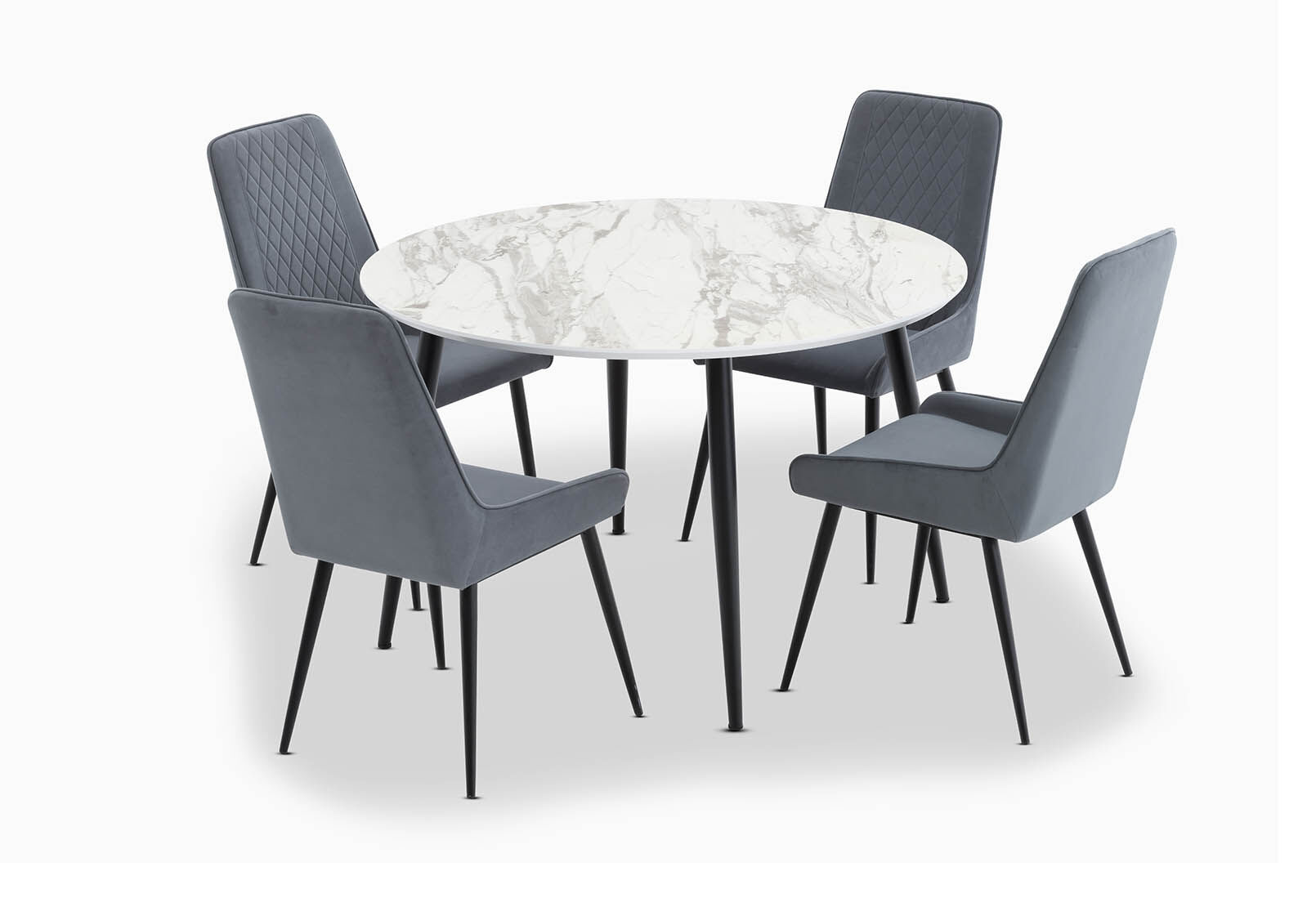 Behold the space-saving marvel: a dining table with a marble vibe that screams, "I'm too cool for a big space!" Complete with four snazzy grey fabric chairs, it's comfort and style doing the tango in your petite dining haven!